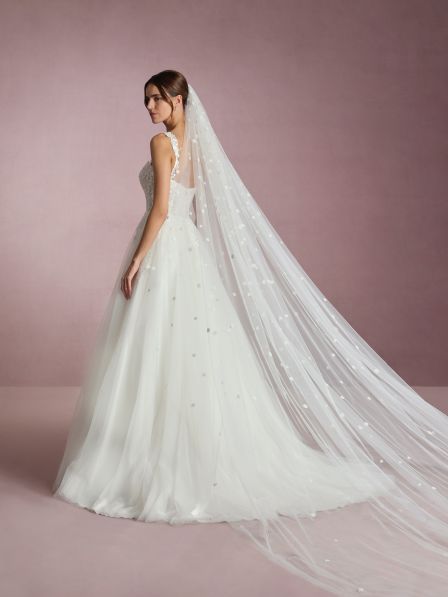 La gonna in tulle leggero si apre in un ampio e fluido volume, donando alla sposa un look etereo e principesco. Questo abito è perfetto per le spose che desiderano un design senza tempo, caratterizzato da linee classiche e dettagli moderni che esaltano la silhouette con dolcezza.