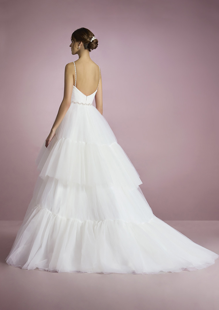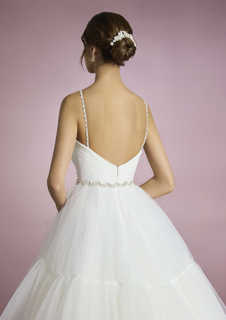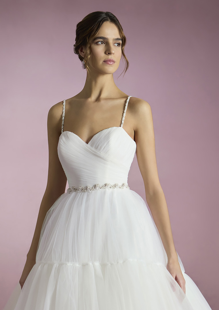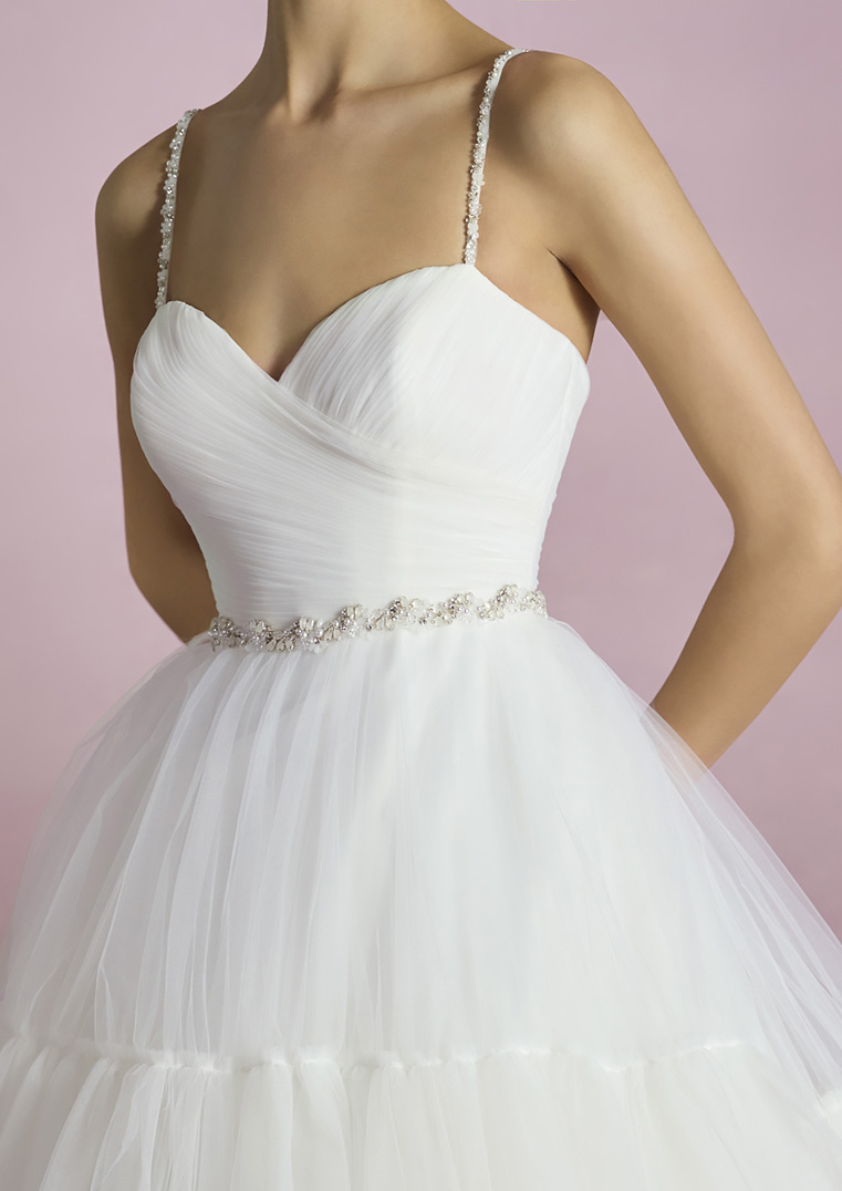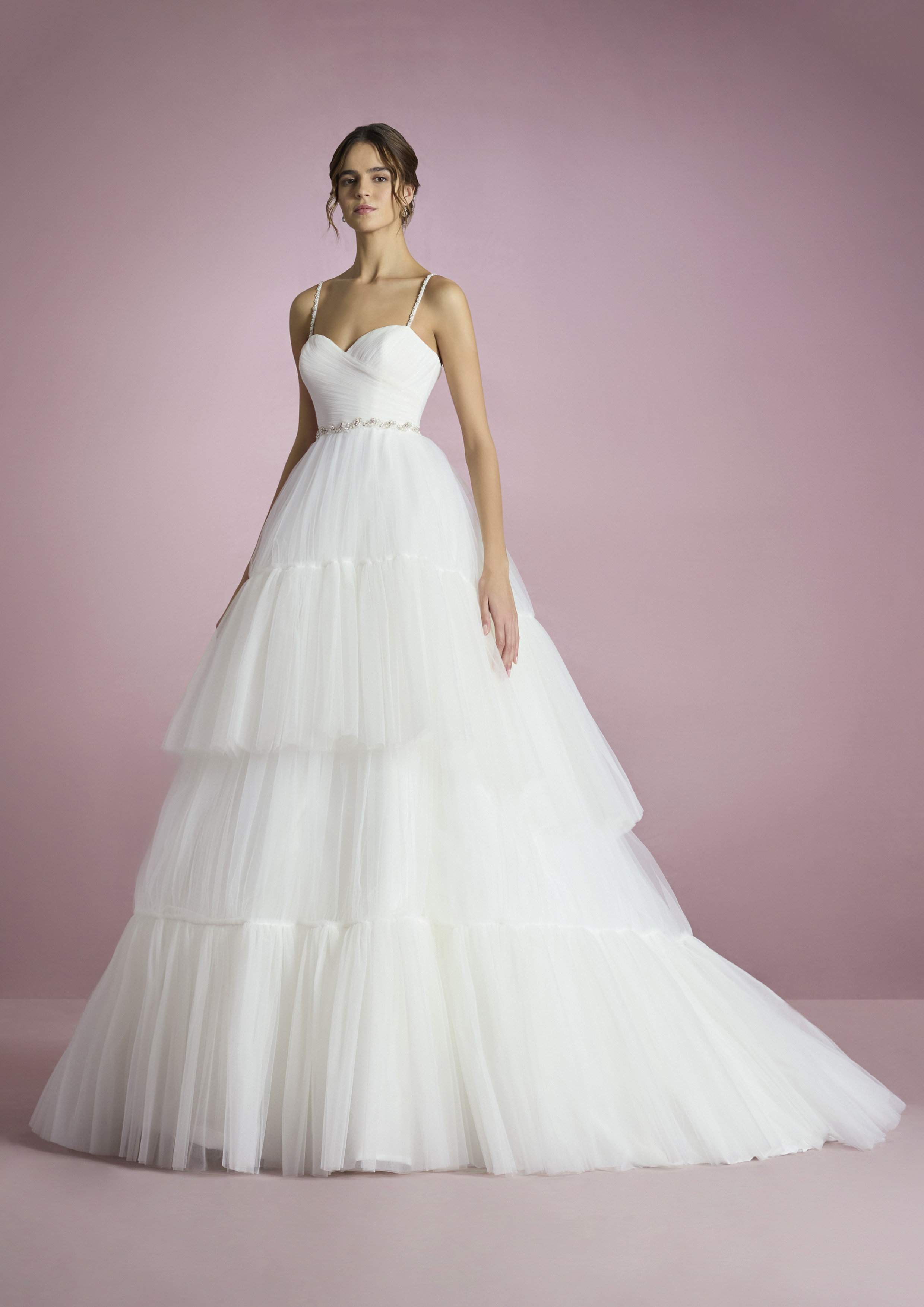 Questo meraviglioso abito da sposa incarna l'eleganza pura grazie al suo design raffinato e senza tempo. Realizzato in soffice tulle bianco, l'abito presenta una silhouette principesca con una gonna ampia a balze, perfetta per una sposa che desidera un look sofisticato e romantico. Il corpetto semplice con spalline sottili, scollo a cuore e decorazioni delicate in vita dona al modello un tocco di leggerezza e grazia.