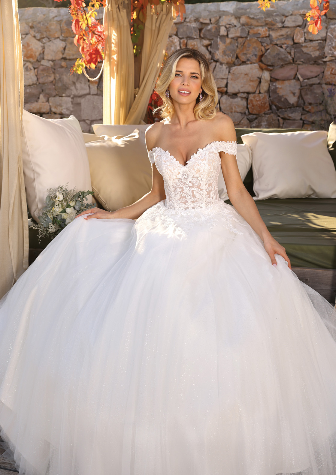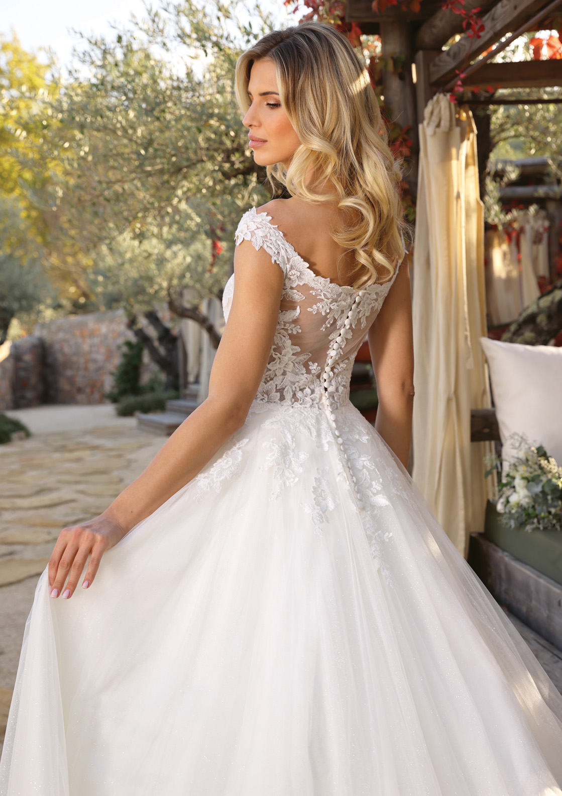 Questo abito da sposa incanta per il suo romantico corpetto in pizzo ricamato che valorizza il décolleté con delicatezza e femminilità. Le spalle scoperte aggiungono un tocco sensuale e contemporaneo, mentre la gonna in tulle glitter si apre in un volume soffice e leggero, perfetto per una sposa che sogna un look principesco. Il dettaglio del pizzo sulla schiena con bottoncini in fila crea un effetto vedo-non-vedo di grande eleganza. Ideale per chi cerca uno stile che mescola tradizione e modernità con grazia, questo abito è pensato per far risplendere ogni sposa nel suo giorno più speciale.