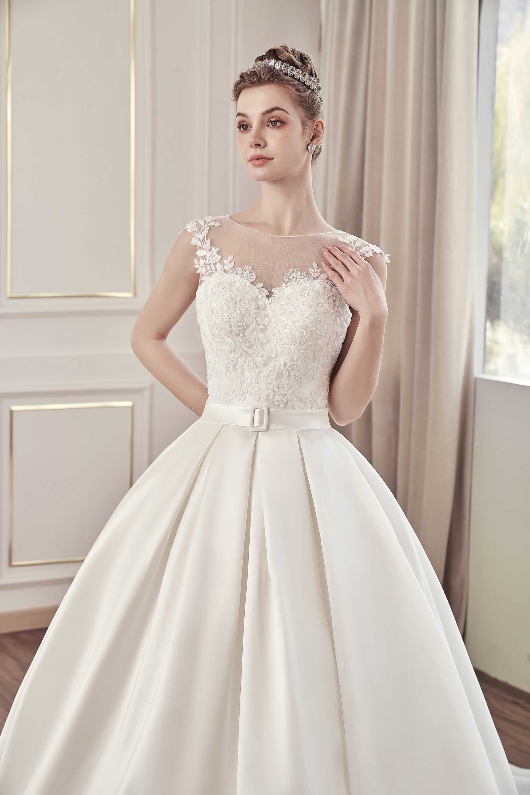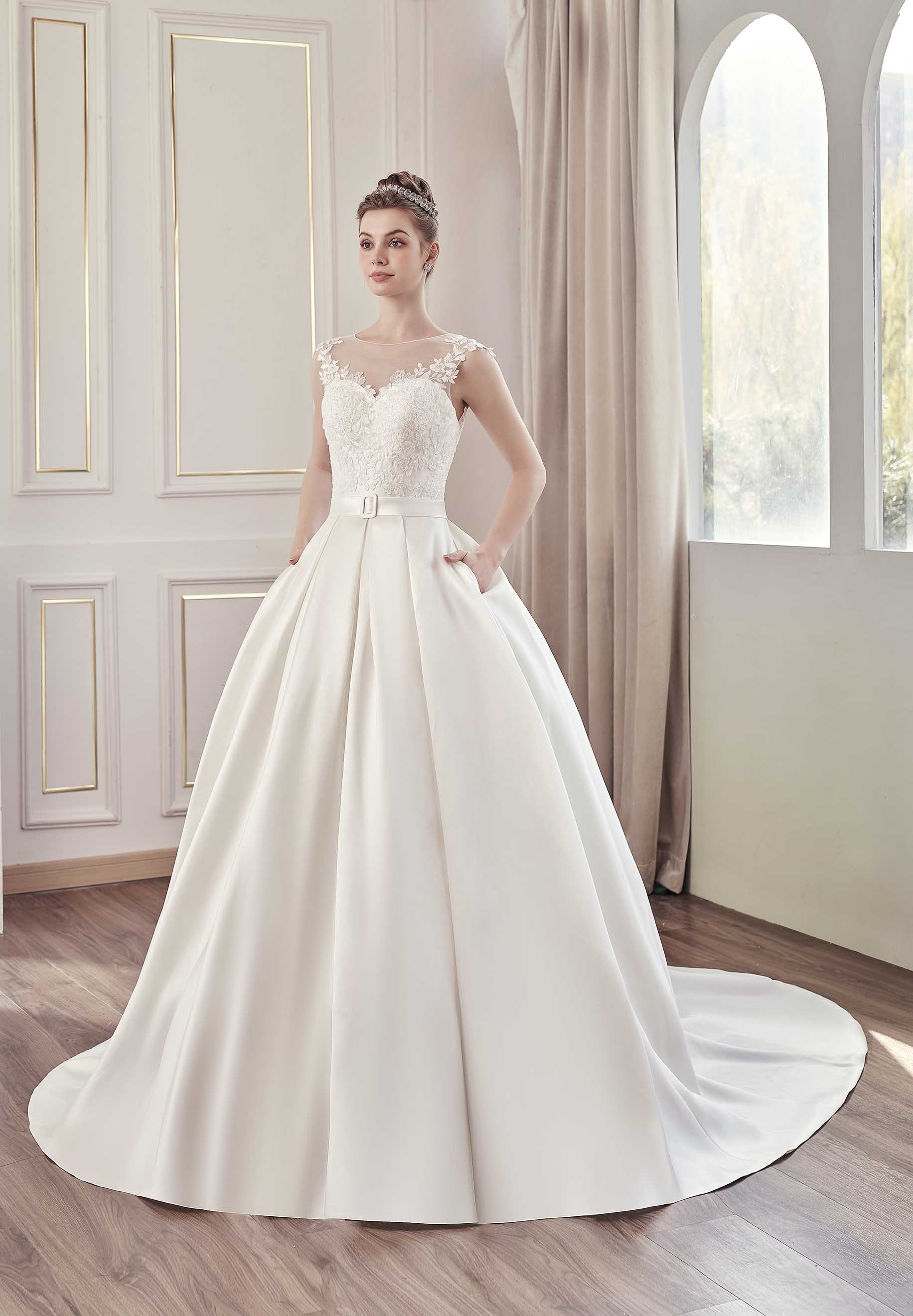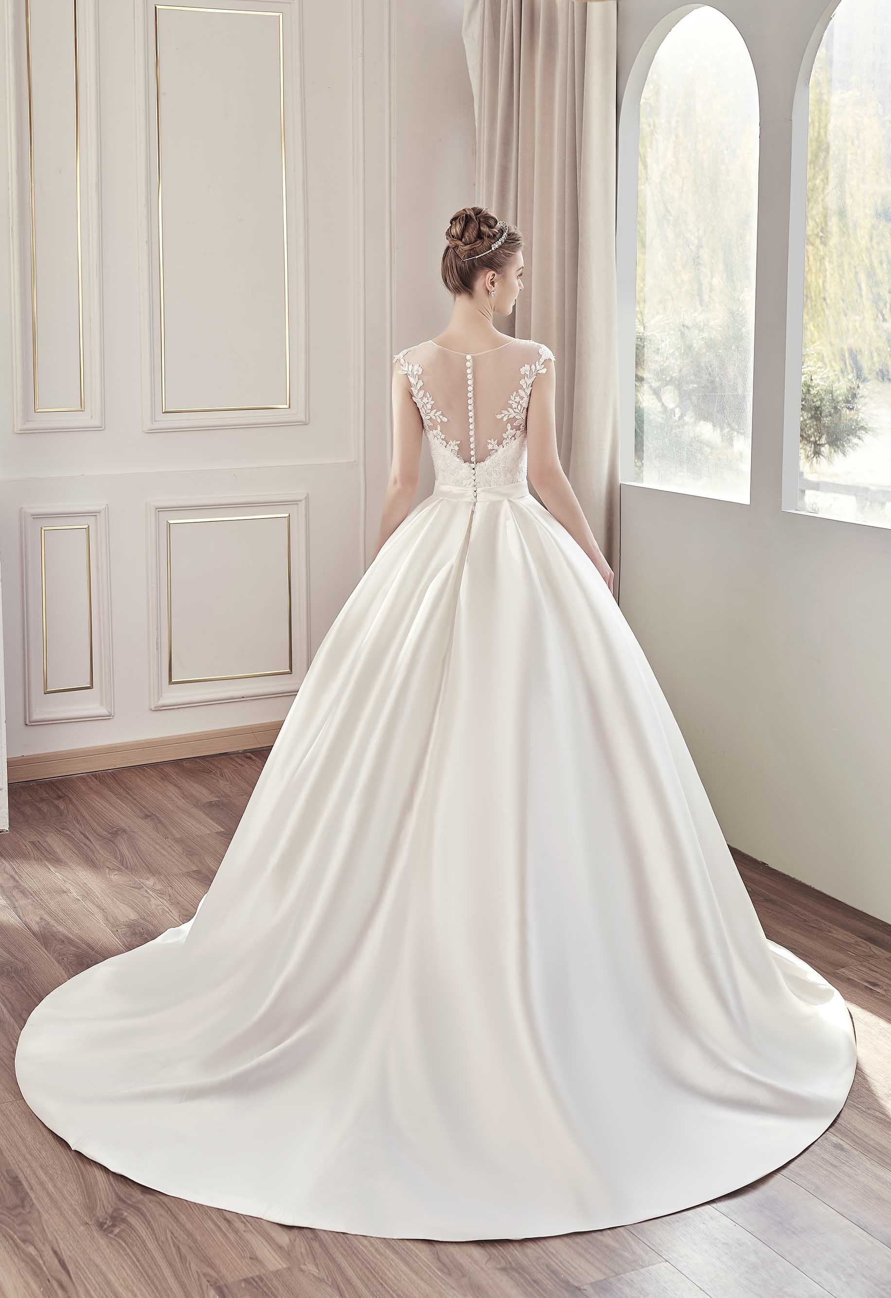 Questo abito da sposa principesco è la perfetta combinazione di eleganza e raffinatezza. Il corpetto, magistralmente lavorato in pizzo floreale, crea un delicato gioco di trasparenze che avvolge la scollatura e le spalle, offrendo un effetto romantico e sofisticato. La gonna voluminosa in tessuto di mikado valorizza con grazia la figura donando un'aria regale. La schiena, impreziosita da un dettaglio di bottoni ricoperti e un inserto trasparente, conferisce un tocco di sensualità senza tempo. Il lungo strascico completa il look da sogno, rendendo questo abito l'ideale per una sposa che desidera un look maestoso e indimenticabile nel giorno del suo "Sì". Perfetto per chi vuole combinare la tradizione con un tocco moderno e raffinato.