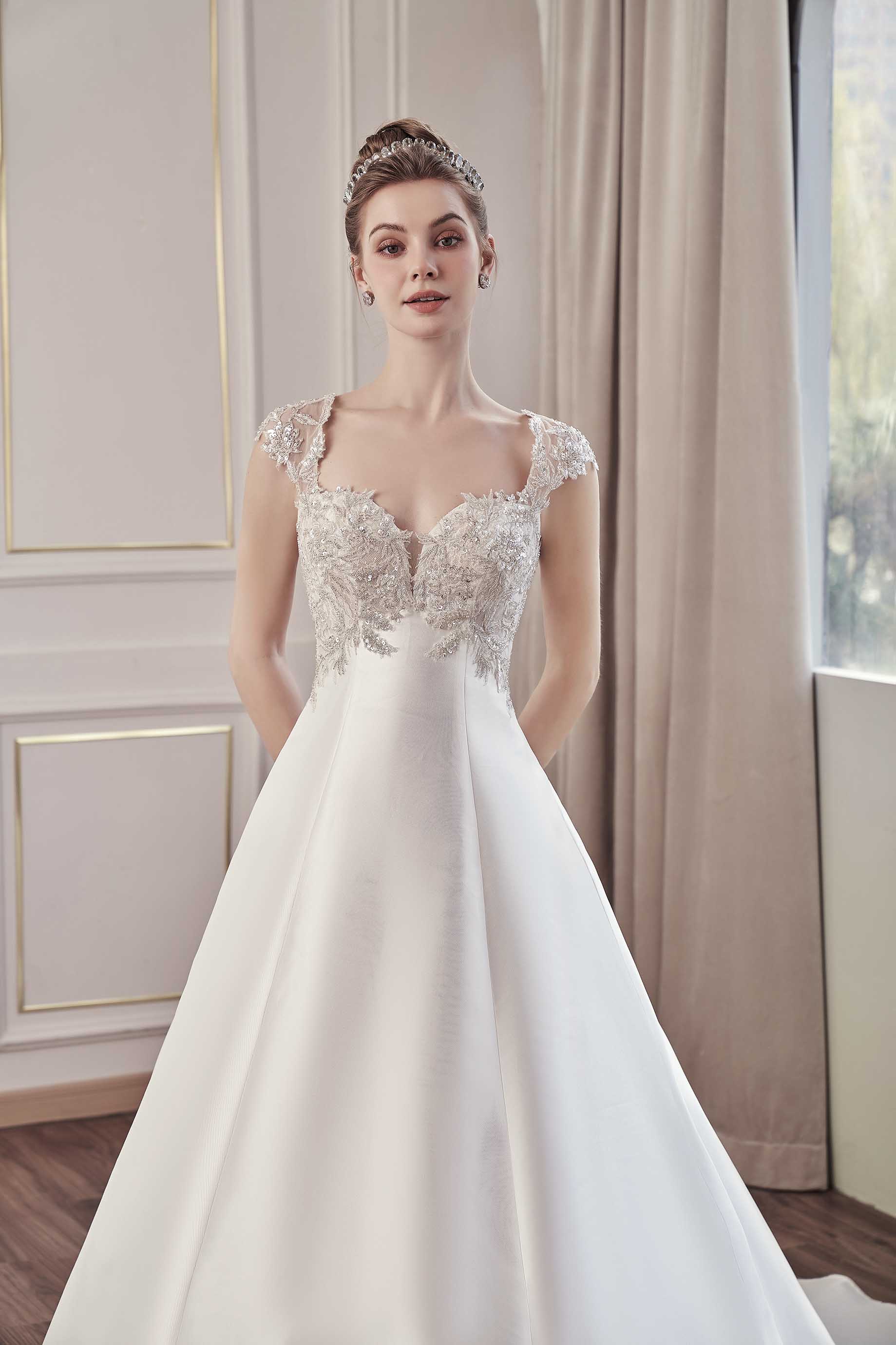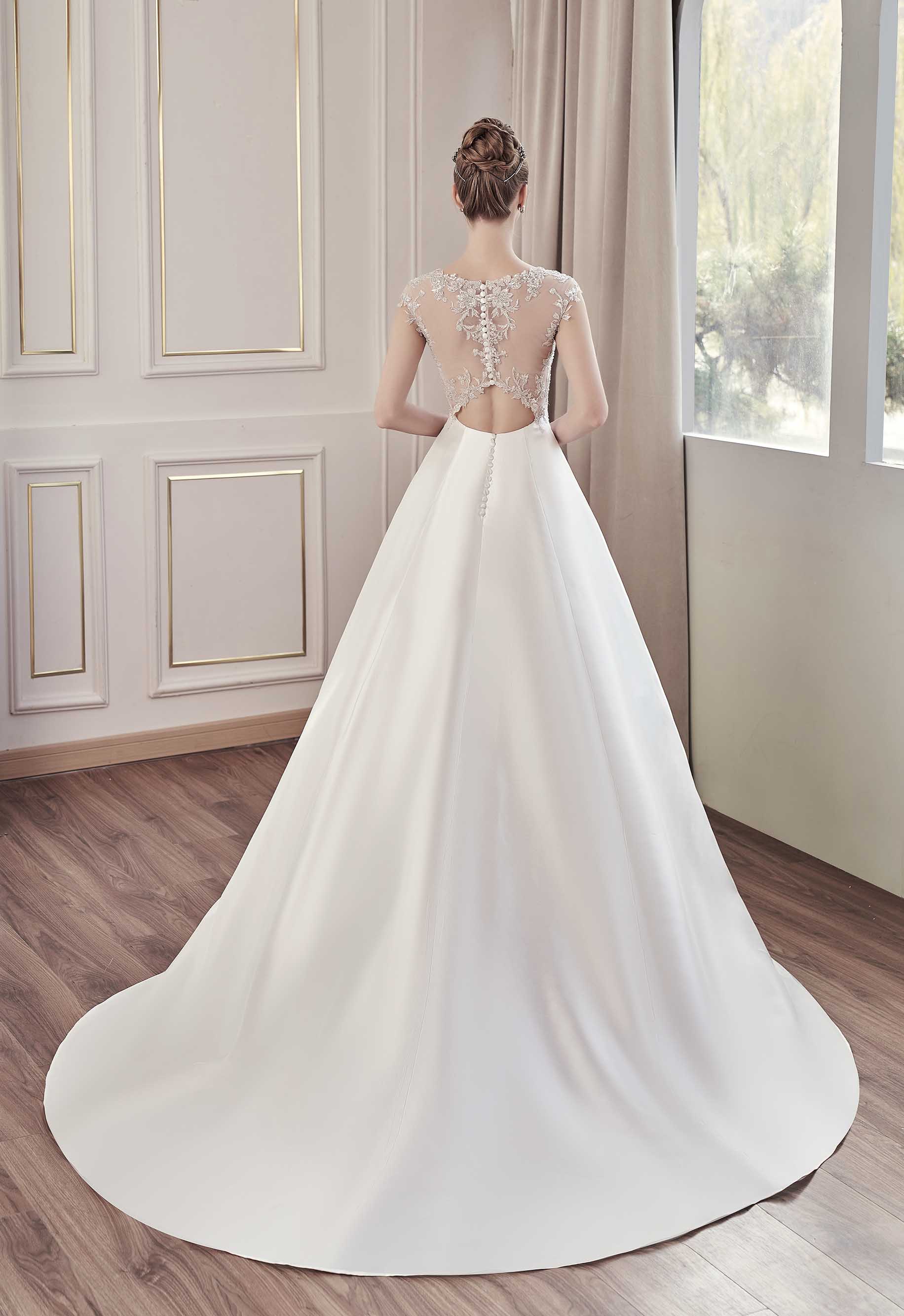 Questo abito da sposa incarna l'eleganza moderna con un tocco di romanticismo classico. Il corpetto in pizzo finemente ricamato si fonde perfettamente con la gonna in morbido mikado perlato, creando un contrasto sofisticato. Lo scollo a cuore velato da un delicato effetto trasparente aggiunge una nota sensuale, mentre la schiena è impreziosita da un dettaglio tattoo con bottoni rivestiti che scendono lungo la silhouette. Il taglio in stile principessa si completa con una gonna voluminosa e morbida, ideale per un'entrata scenografica. Perfetto per una sposa che sogna un look raffinato ma ricercato.