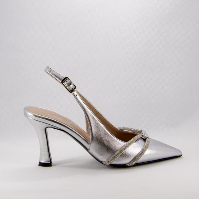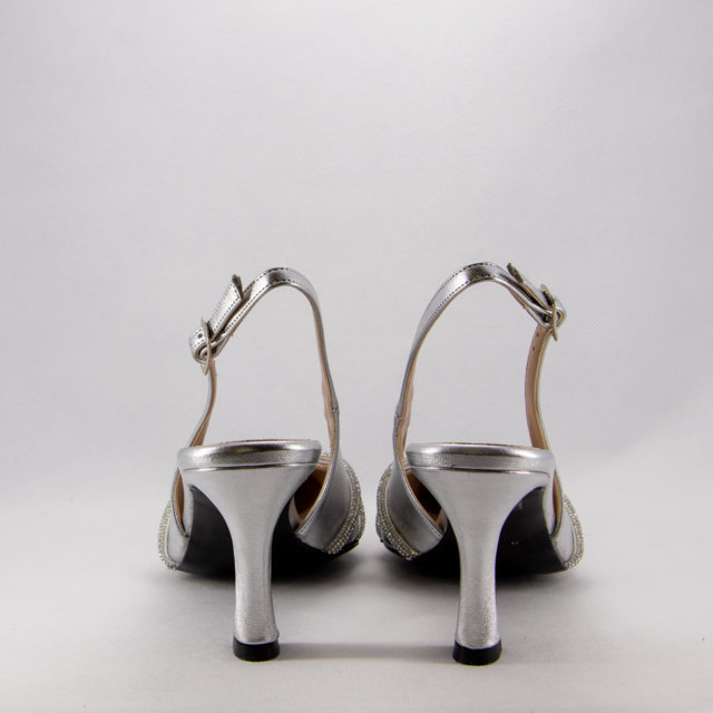 Queste raffinate scarpe décolleté da cerimonia in argento sono l'emblema dell'eleganza moderna. Realizzate con materiali di alta qualità, si distinguono per il cinturino regolabile che assicura una perfetta vestibilità e per i delicati dettagli luminosi sul dorso del piede, che aggiungono un tocco glamour. La punta affusolata e il tacco slanciato conferiscono un fascino senza tempo, perfetto per completare qualsiasi look da cerimonia o occasione speciale. Indossale per brillare in ogni passo e rendere unico il tuo stile.