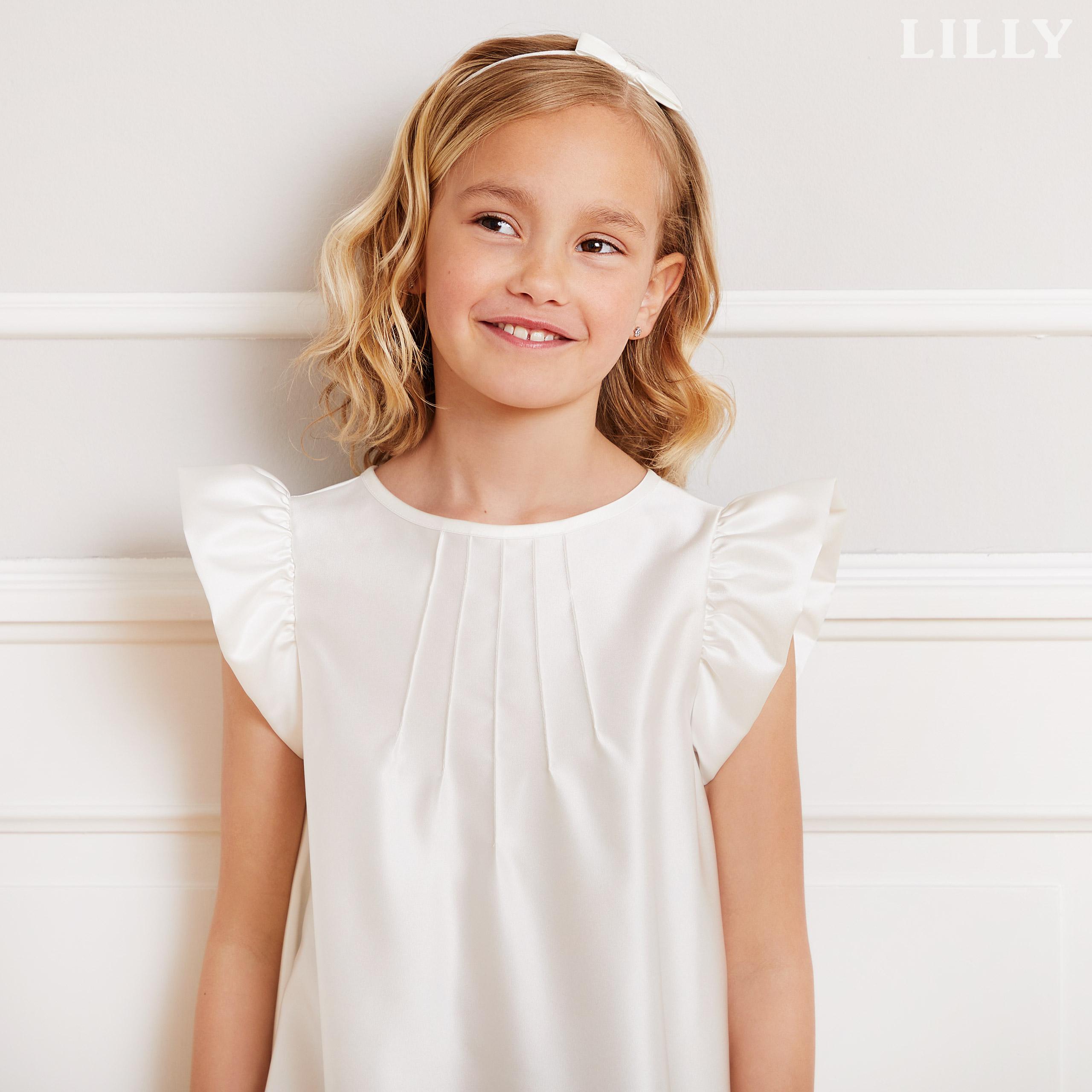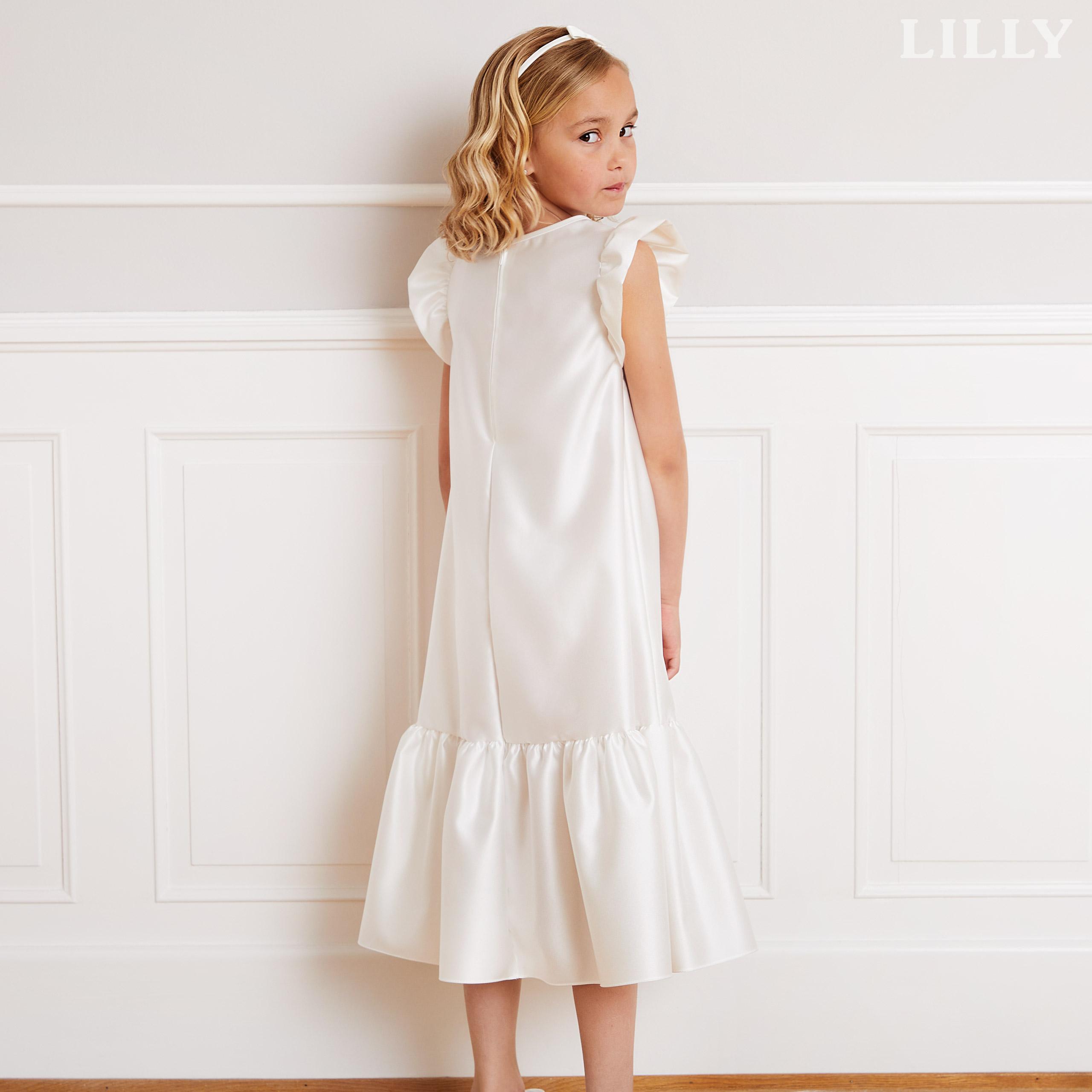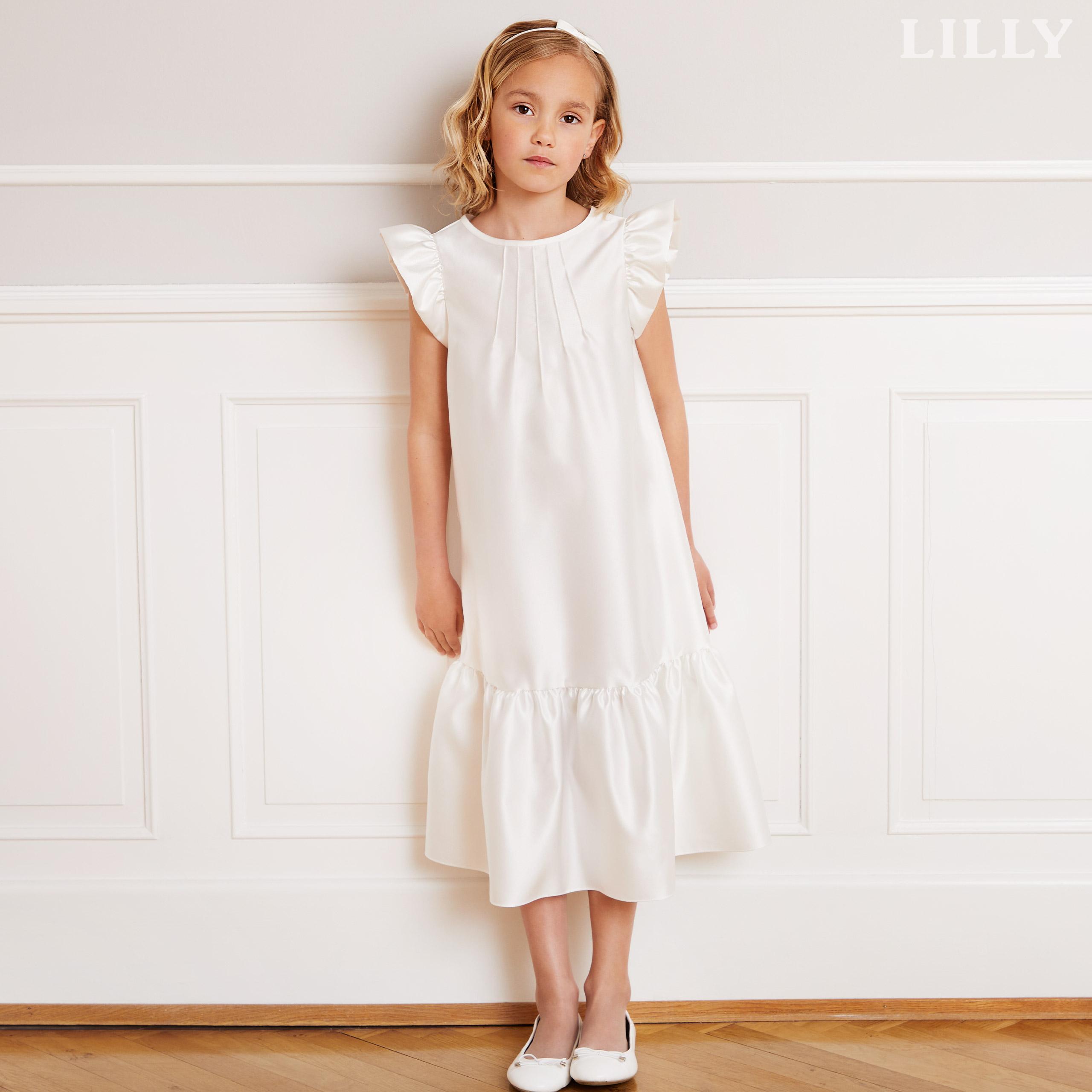Delicato e raffinato, l’abito è pensato per le giovani damigelle o per una cerimonia di Prima Comunione, aggiungendo un tocco di dolce eleganza a una giornata speciale. Realizzato in tessuto satinato con una leggera lucentezza, questo modello presenta delle morbide ruches sulle maniche, che donano al capo una leggerezza senza tempo. La gonna con balza arricciata cade con grazia, creando un movimento incantevole ad ogni passo. Perfetto per le piccole che desiderano sentirsi come principesse, questo abito è una scelta ideale per cerimonie eleganti, mantenendo uno stile sobrio ma raffinato. Abbinalo a un paio di scarpette bianche o argentate per completare un look impeccabile e armonioso.