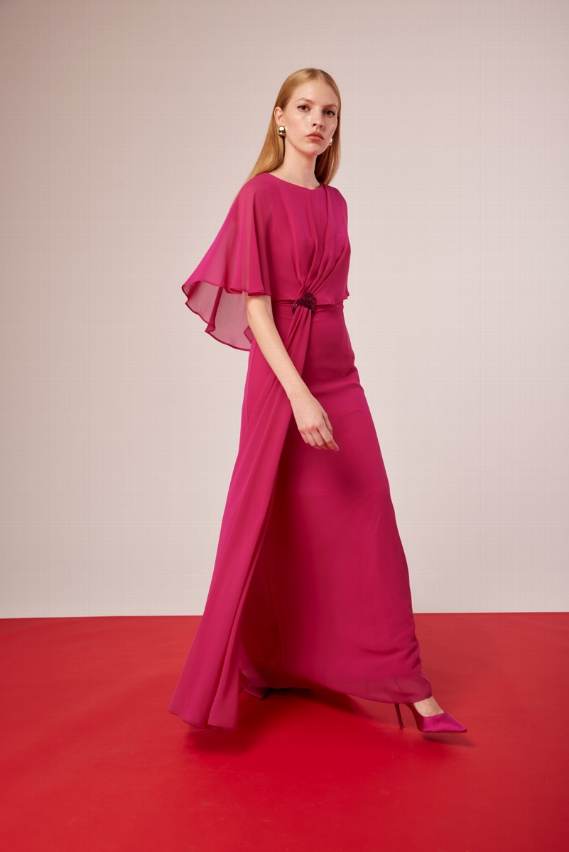 Lasciati avvolgere dall'eleganza fluida di questo abito da cerimonia realizzato in chiffon leggero e impalpabile. La vibrante tonalità fucsia esprime personalità e raffinatezza, perfetta per la donna che desidera risplendere con uno stile sofisticato e contemporaneo. Le maniche a mantella, ampie e vaporose, scivolano delicatamente lungo le braccia, donando movimento e un tocco etereo a ogni passo.