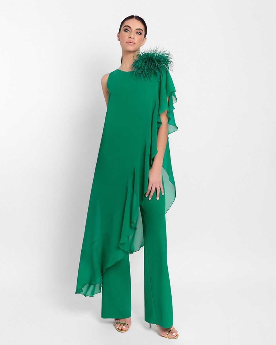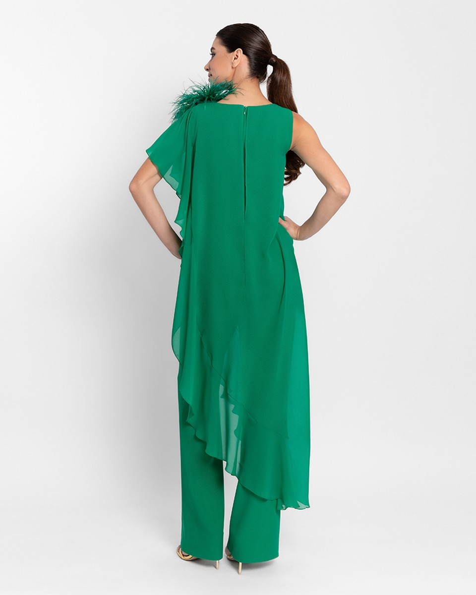 Porta un tocco di eleganza contemporanea al tuo guardaroba con questo raffinato completo da cerimonia in chiffon color verde bandiera, un capo pensato per distinguersi con classe. La leggerezza del tessuto chiffon dona un'eleganza fluttuante, esaltata da un design asimmetrico con strati morbidi che scivolano con grazia. La silhouette ampia e confortevole è impreziosita da un'applicazione removibile in piume di marabù, posta strategicamente sulla spalla per un effetto glamour ed esclusivo.