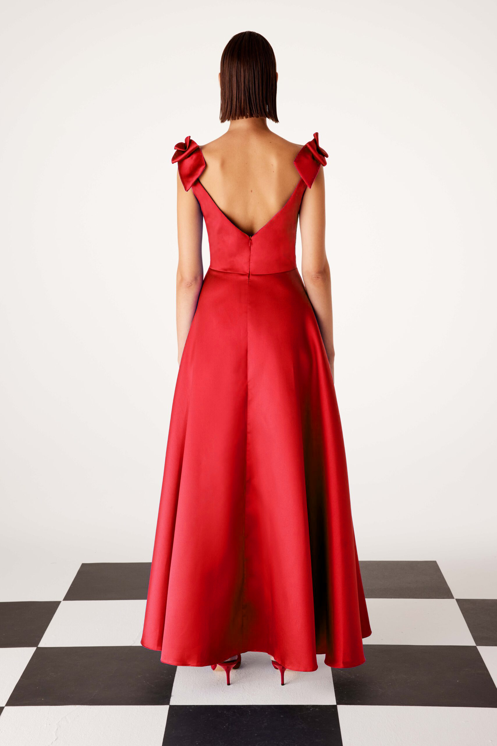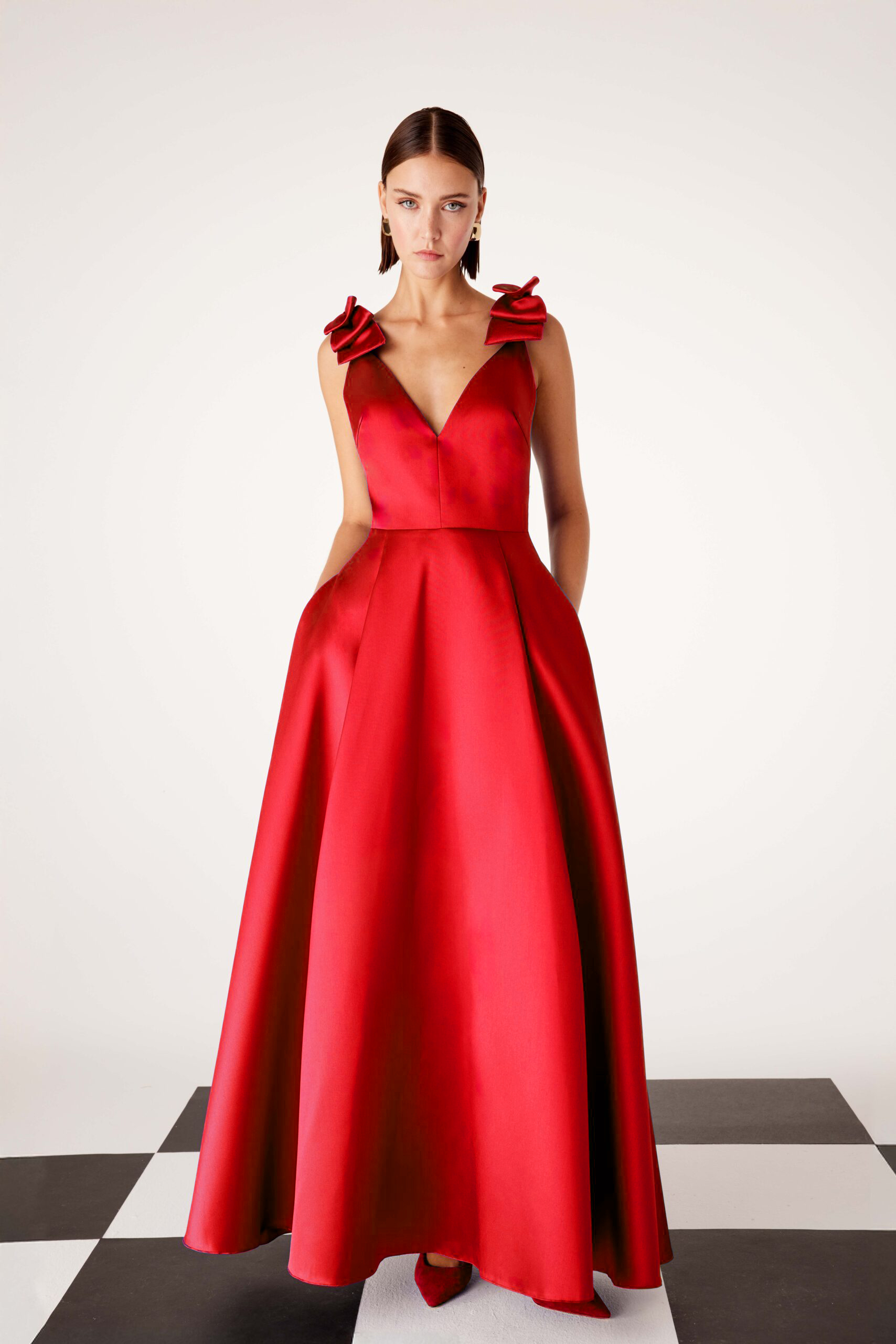 Lasciati avvolgere dall’intensità e dall’eleganza senza tempo di questo sofisticato abito da cerimonia in mikado rosso. Il design valorizza la silhouette con una gonna ampia e strutturata, che dona un movimento regale a ogni passo. Il corpino dal taglio impeccabile presenta uno scollo a V, incorniciato da raffinate spalline con fiocchi decorativi, per un tocco di femminilità esclusiva. Perfetto per cerimonie, serate di gala ed eventi speciali, questo abito è pensato per chi desidera distinguersi con stile e classe.