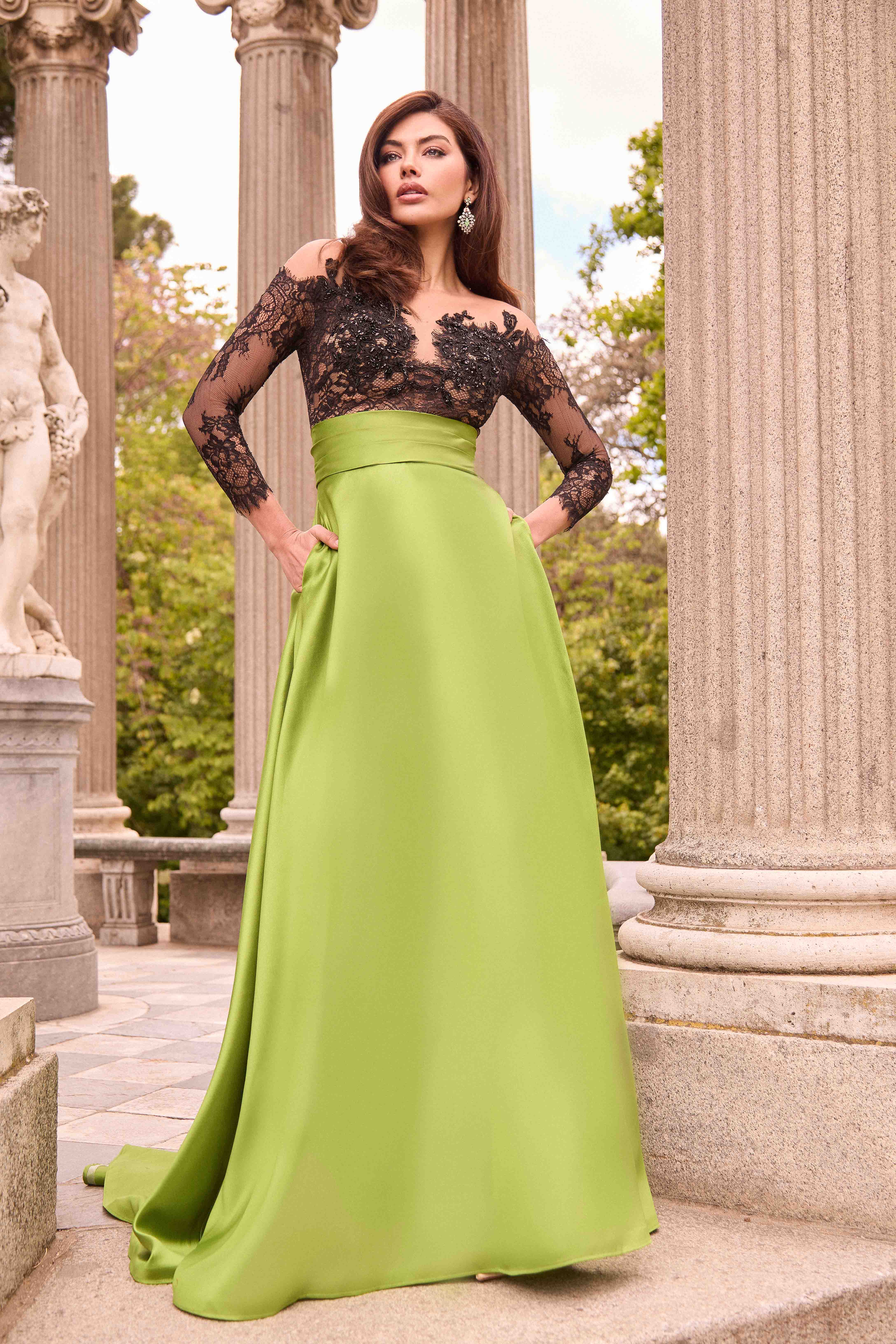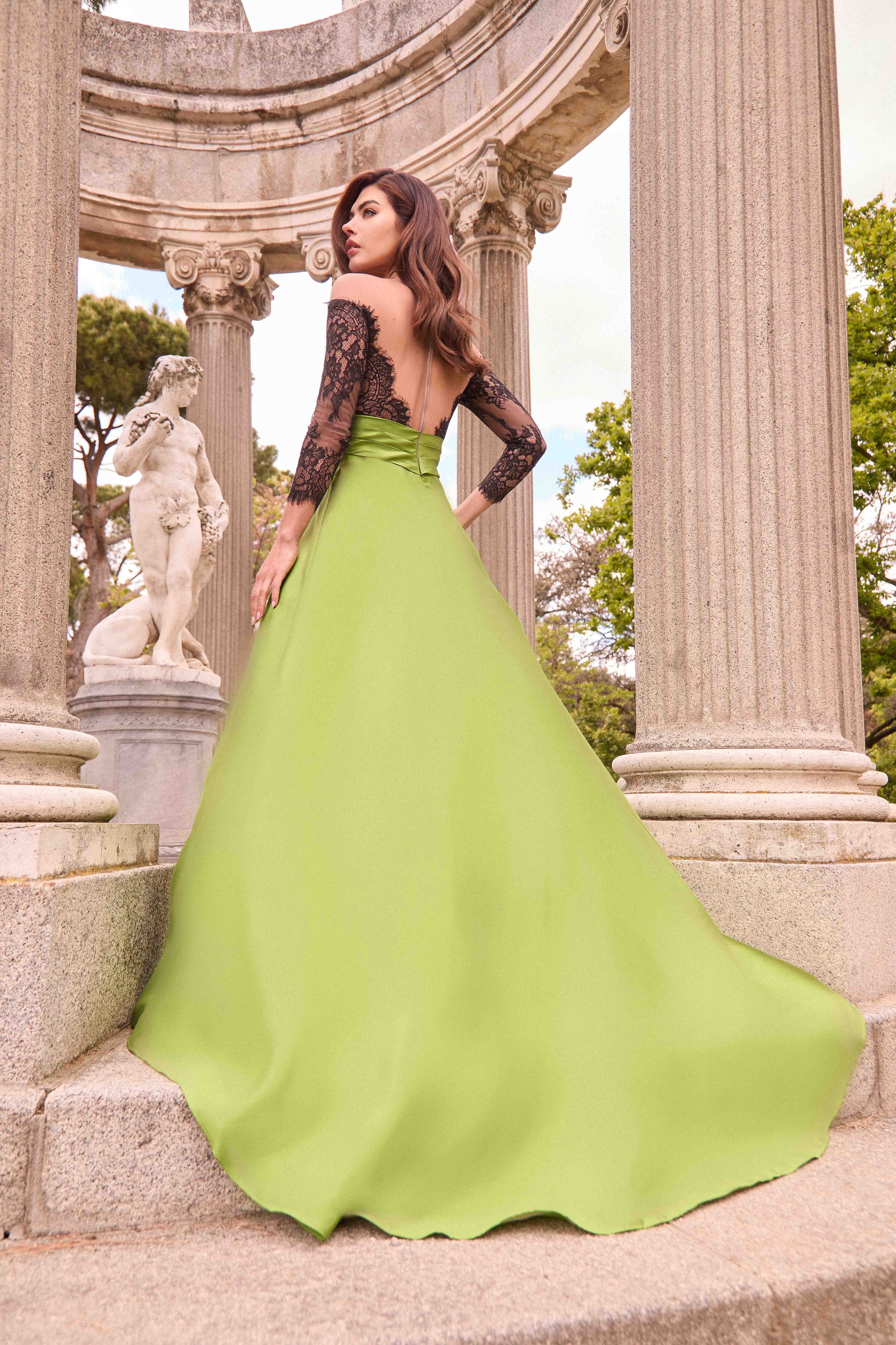 Tessuto mikado verde con corpetto in pizzo nero ricamato