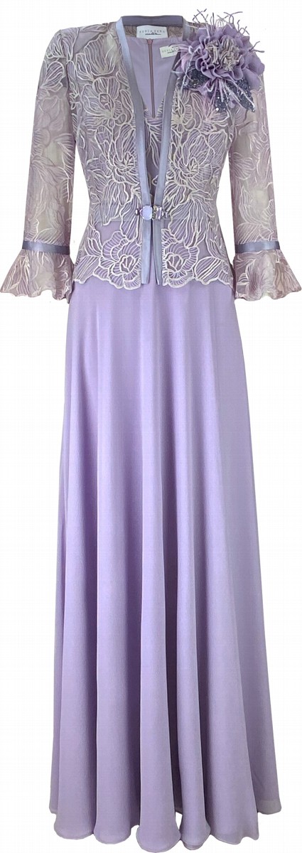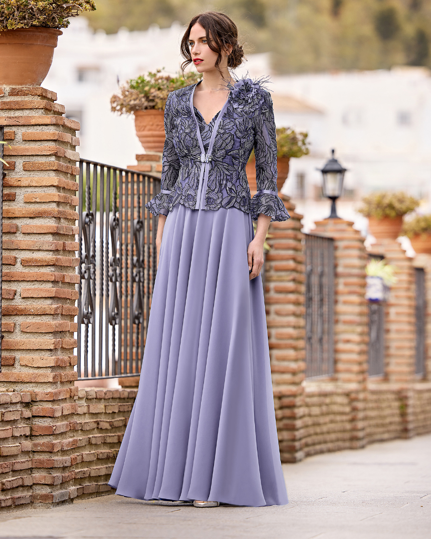 Raffinato e romantico, questo abito lungo da cerimonia in color rosa malva unisce leggerezza e pregio sartoriale in un look dall’eleganza senza tempo. Il corpetto lavorato in pizzo floreale si distingue per la cura dei dettagli e la trasparenza sofisticata, valorizzata da una giacca coordinata con maniche a campana e bordature in raso tono su tono. Il fiore applicato removibile sulla spalla aggiunge un elemento scenografico ma discreto, perfetto per personalizzare il look secondo l’occasione.