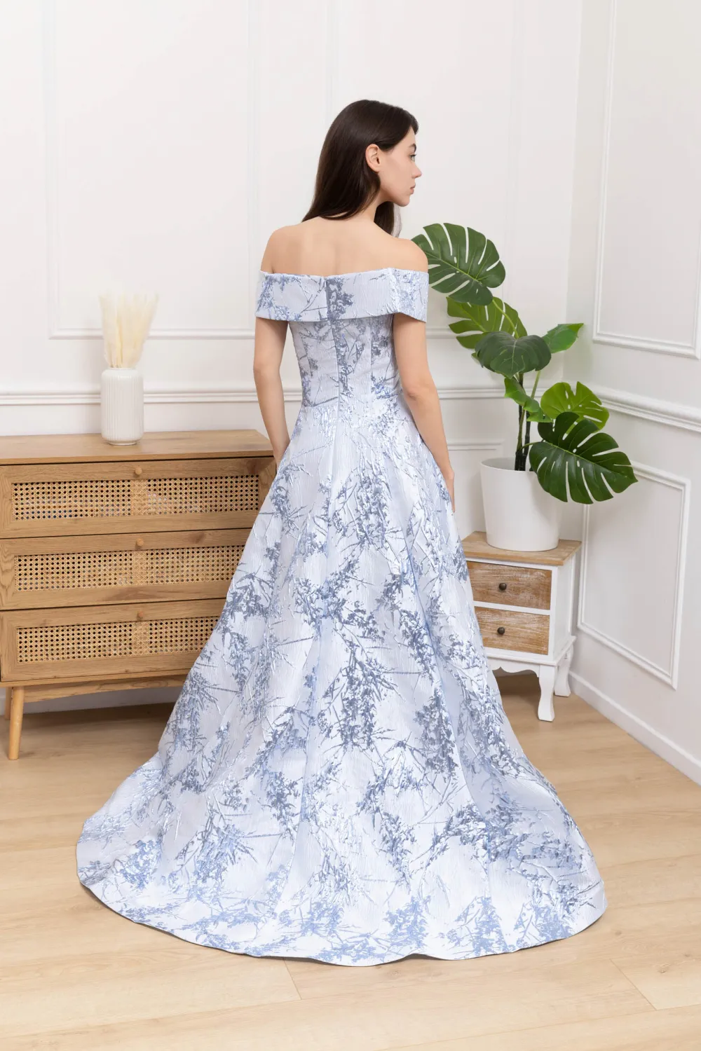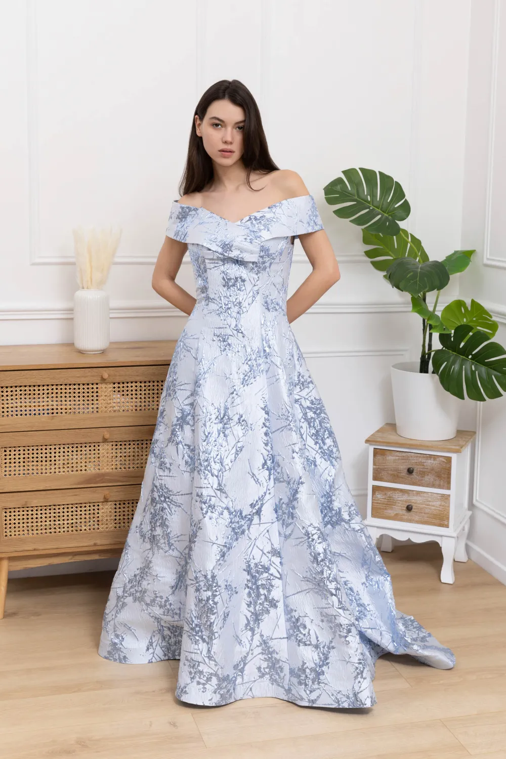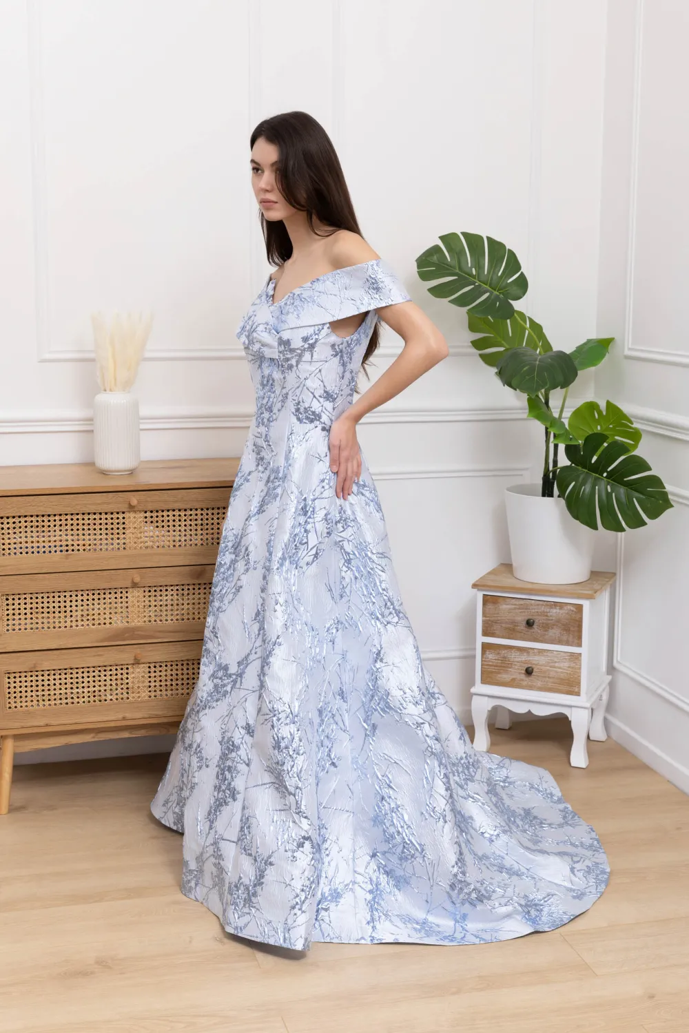 Abito da cerimonia in broccato celeste, perfetto per chi desidera distinguersi con eleganza e personalità. La linea scivolata e la gonna ampia creano una silhouette armoniosa, mentre il corpetto con scollo a barchetta esalta le spalle con raffinata delicatezza. Il disegno floreale tono su tono sul tessuto dona un effetto tridimensionale, che cattura la luce in modo unico e valorizza la figura. Un abito pensato per eventi importanti, dove il dettaglio e la qualità del tessuto diventano protagonisti, rendendo ogni momento davvero indimenticabile.Caratteristiche: