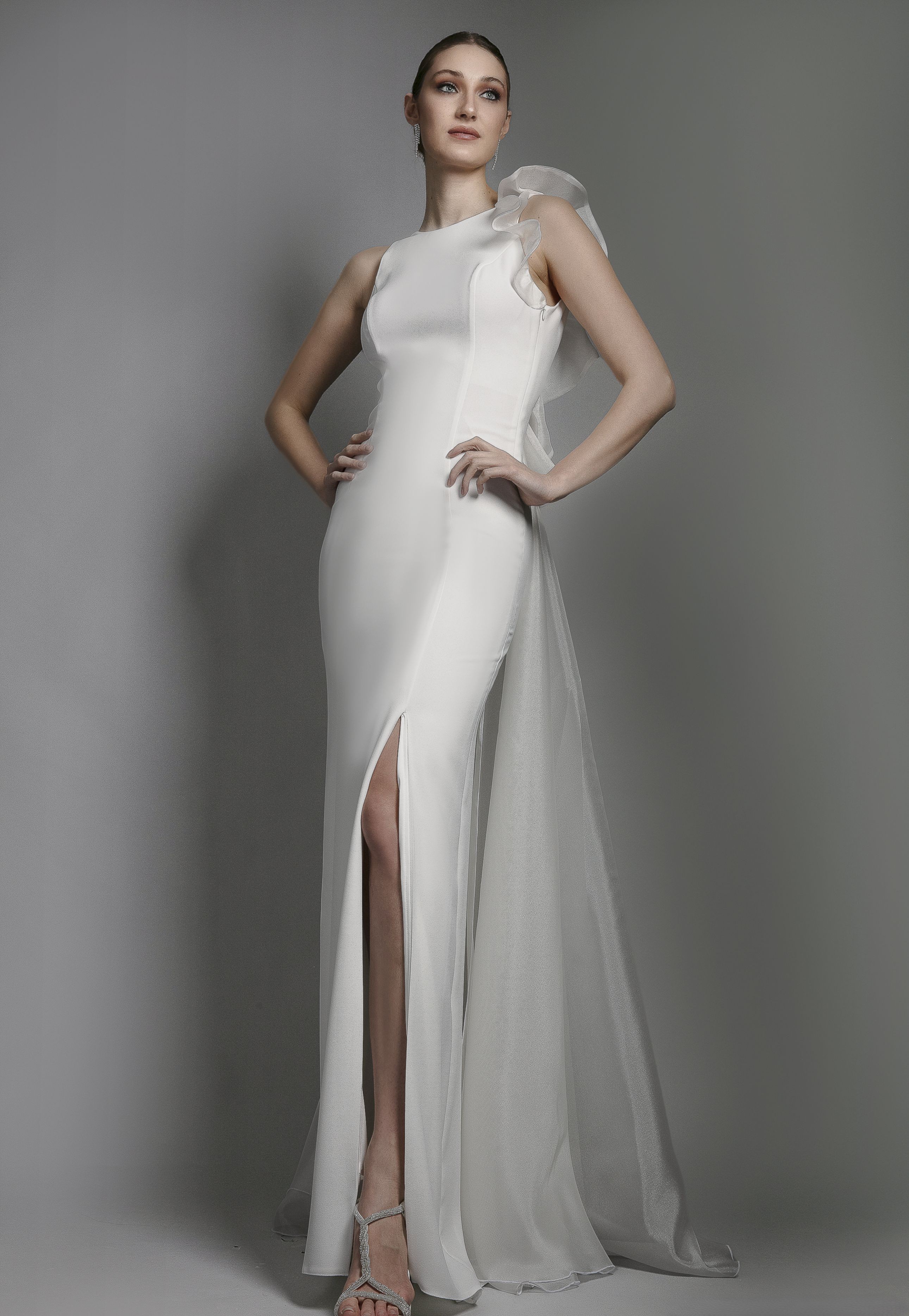 Questo vestito da sposa presenta una silhouette che valorizza le forme con eleganza, mentre il profondo spacco laterale aggiunge un tocco seducente e sofisticato. Il protagonista assoluto è il volant asimmetrico che accarezza una sola spalla, donando movimento e volume. Sul retro, una scollatura profonda sulla schiena si apre con grazia, impreziosita da un fiocco strutturato e un delicato strascico in organza, che dona leggerezza e teatralità all’insieme.
