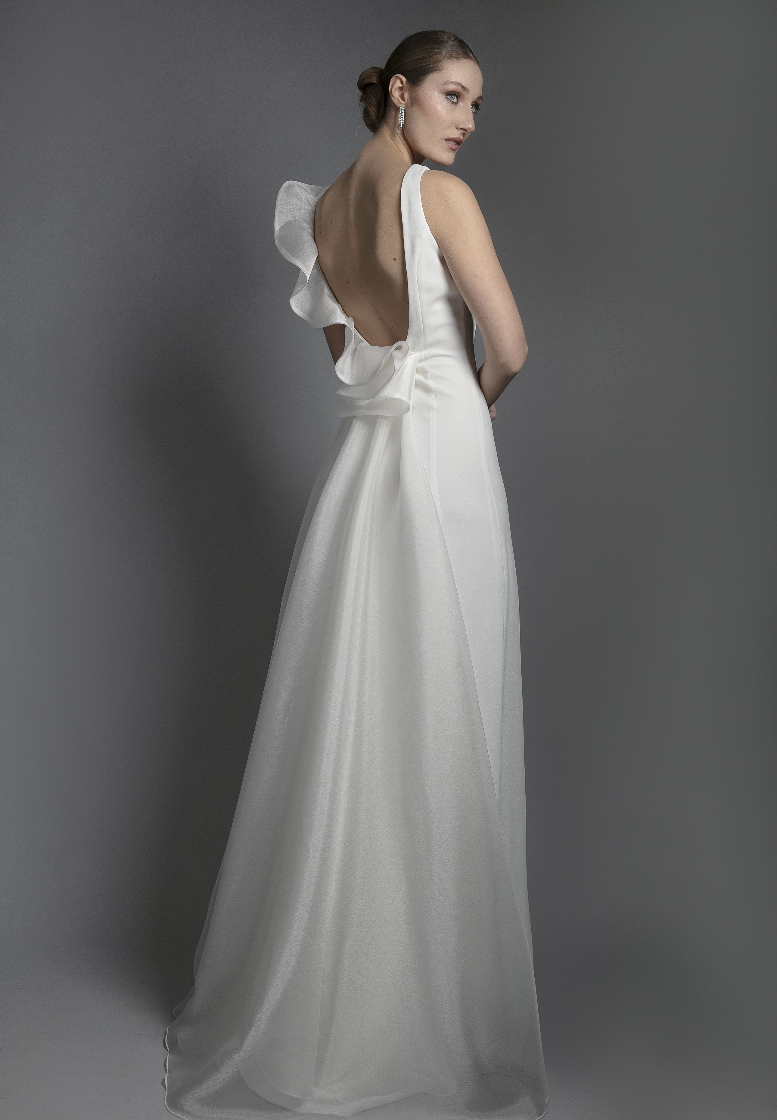 Scopri l’equilibrio perfetto tra audacia e raffinatezza con l’abito da sposa, un modello contemporaneo che unisce linee pulite a dettagli scultorei di grande impatto.