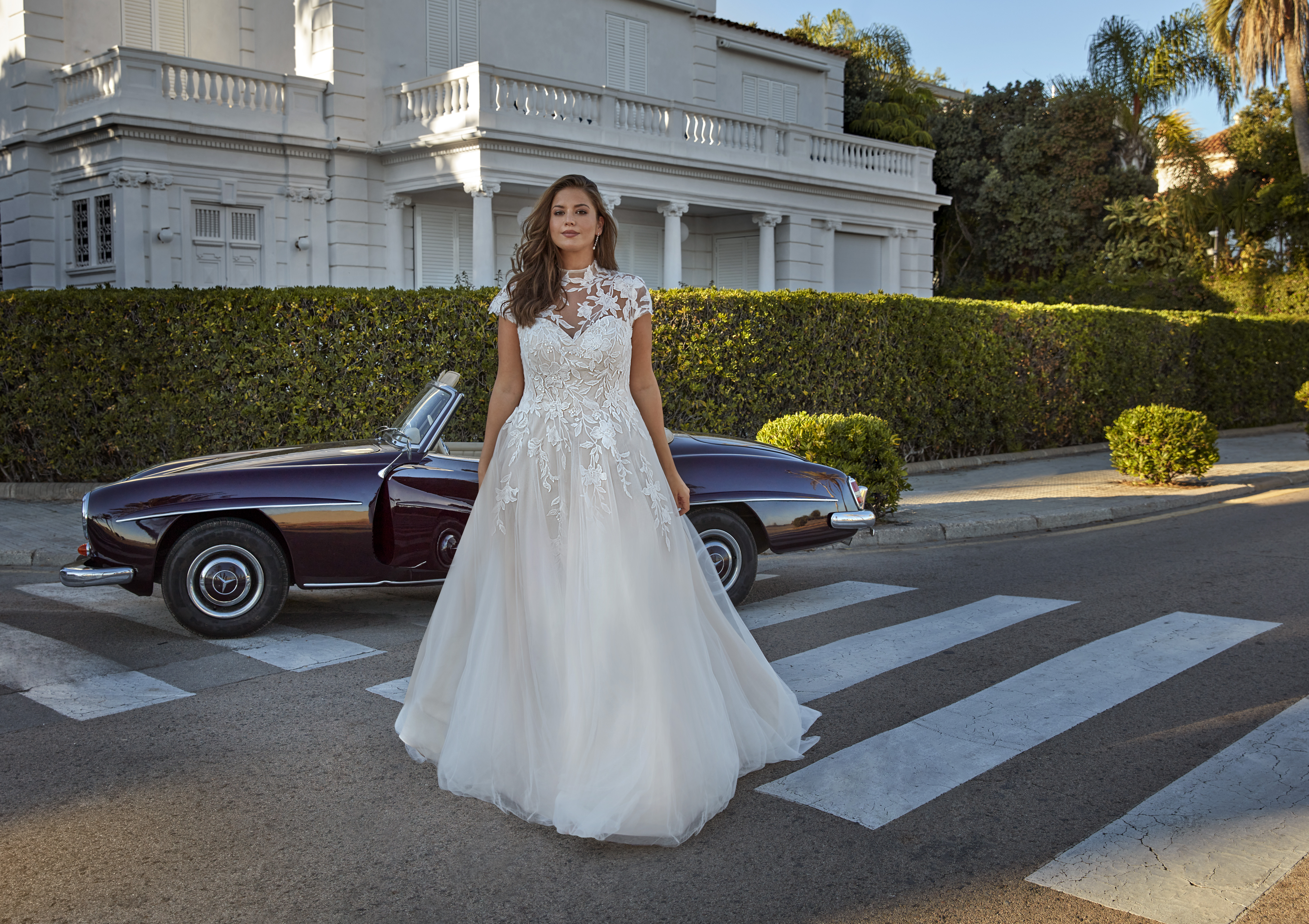 Il corpetto in pizzo ricamato si distingue per i suoi motivi floreali delicati e raffinati, valorizzati da una trasparenza strategica sul décolleté e sulla schiena, chiusa da una fila di bottoncini discreti. Il collo alto effetto tattoo e le maniche corte in pizzo conferiscono all’abito un’eleganza sofisticata, perfetta per chi desidera coprire con grazia le spalle senza rinunciare a uno stile moderno e seducente.
