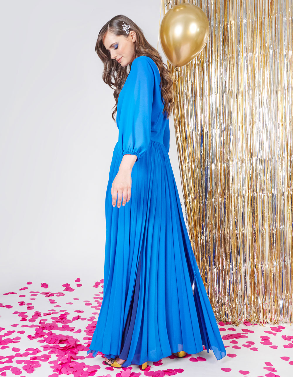 Abito cerimonia donna lungo con scollo a barchetta realizzato in morbidissimo tessuto chiffon plissè color bluette con inserto blu e maniche fluide a palloncino.