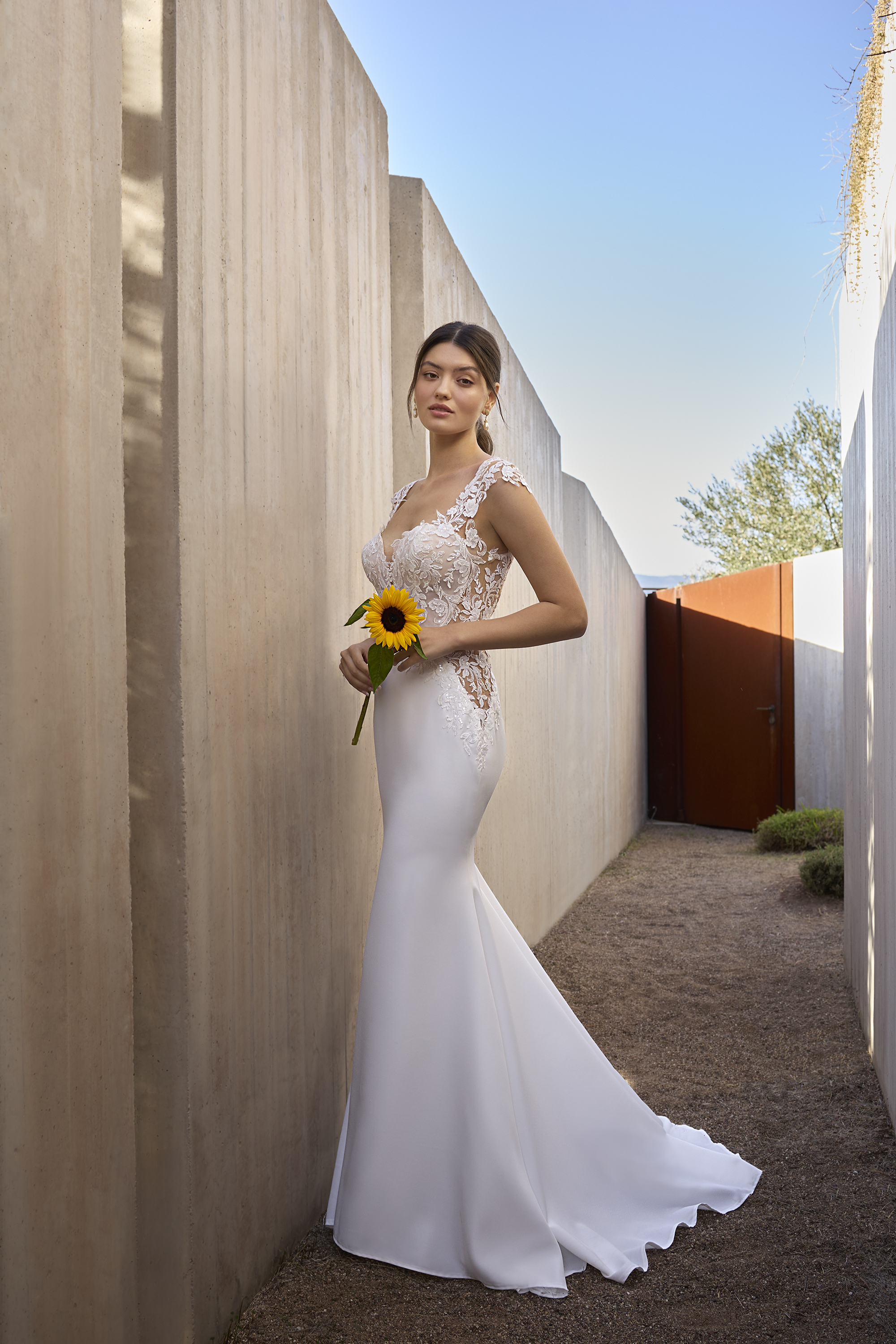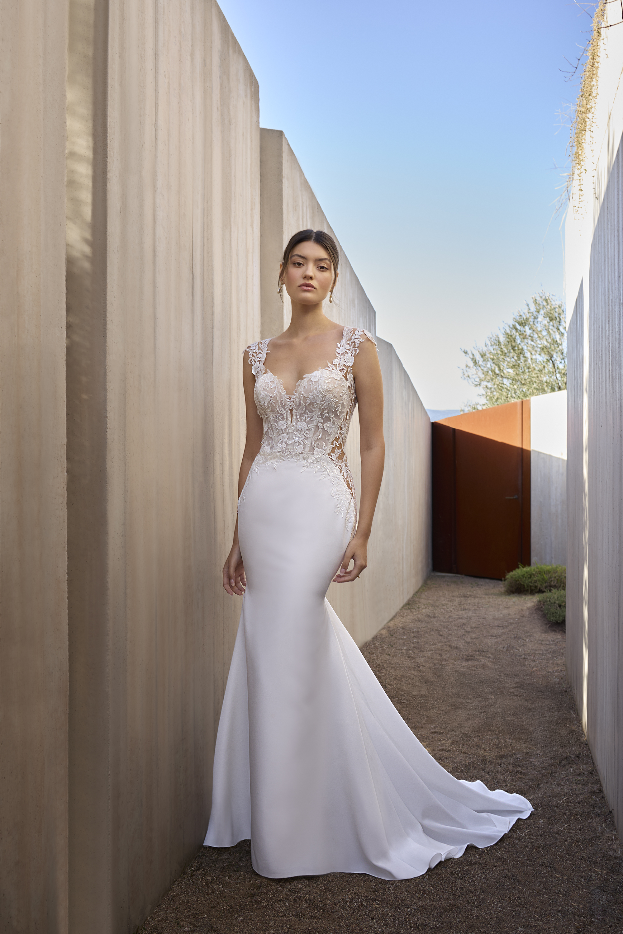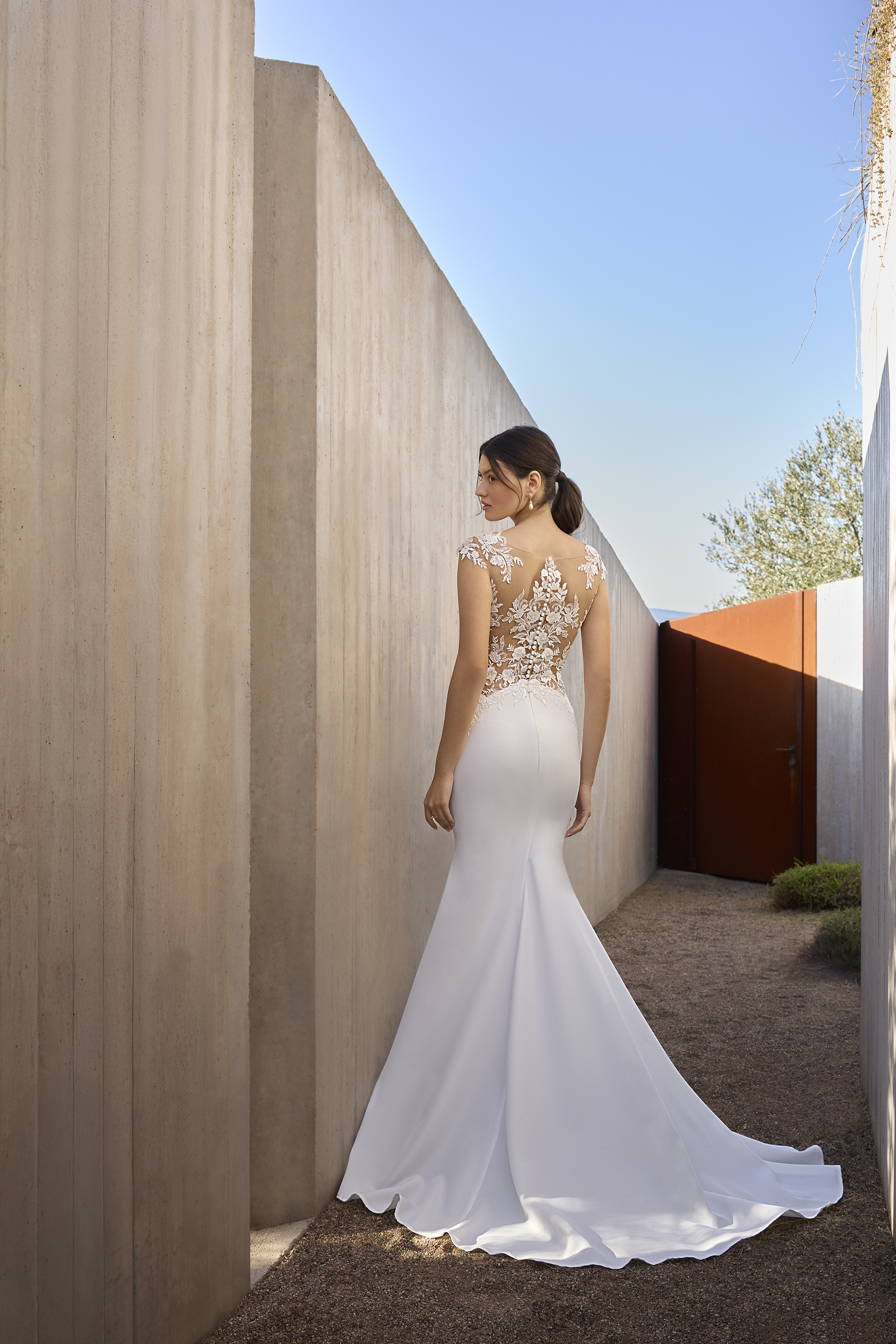 La gonna in crepe, minimal e pulita, scivola sulle forme fino ad aprirsi in uno strascico delicato che accompagna ogni passo con armonia. Il retro, completamente decorato in pizzo con trasparenze studiate, regala una visione mozzafiato che lascia il segno.