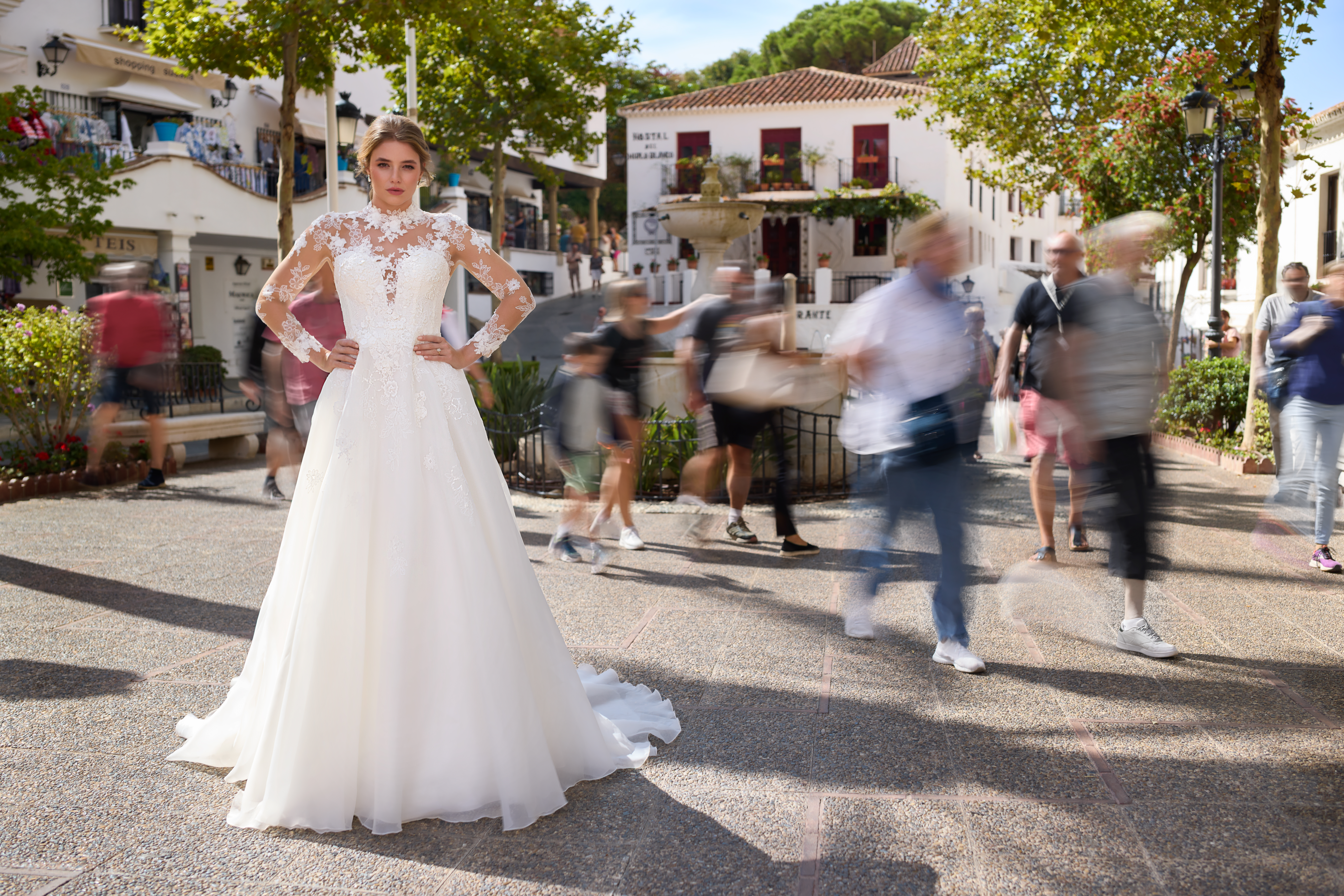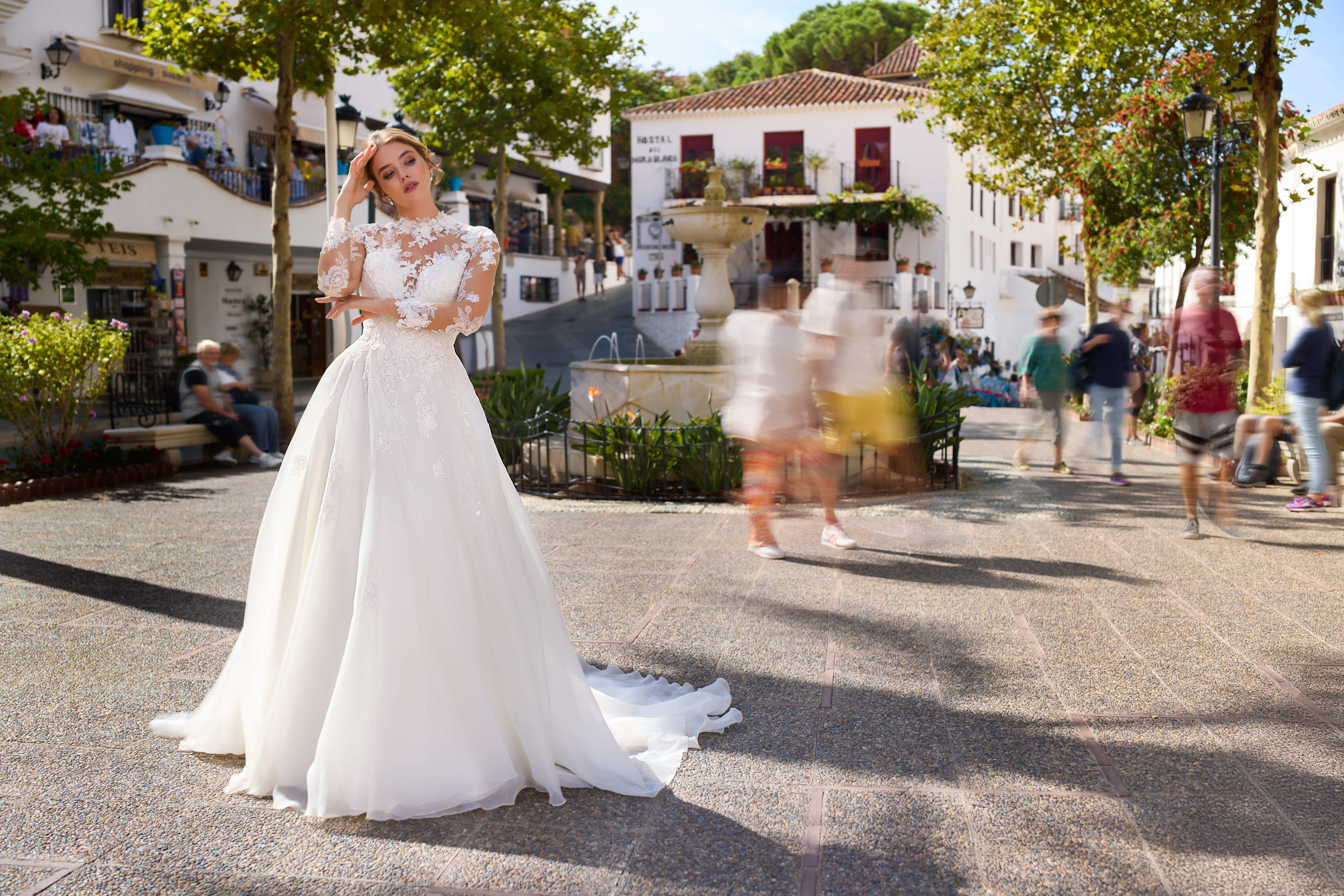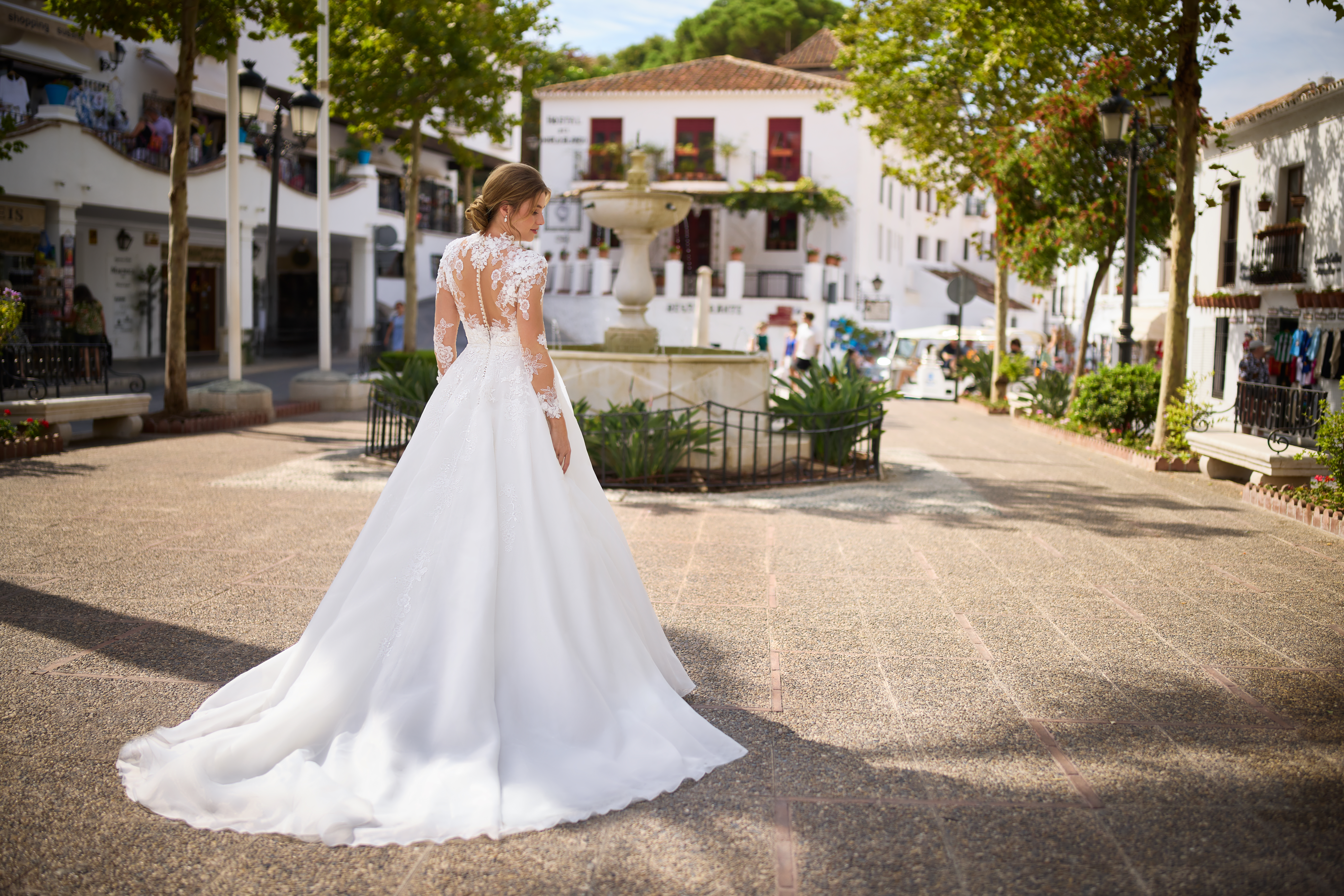 Il corpetto è un capolavoro di trasparenze: il pizzo floreale si posa delicatamente sulla pelle con un raffinato effetto tattoo sia sul décolleté che sulla schiena, creando un equilibrio perfetto tra romanticismo e sensualità. Le maniche lunghe in tulle con ricami coordinati donano un tocco sofisticato e incorniciano il busto con una grazia quasi eterea.