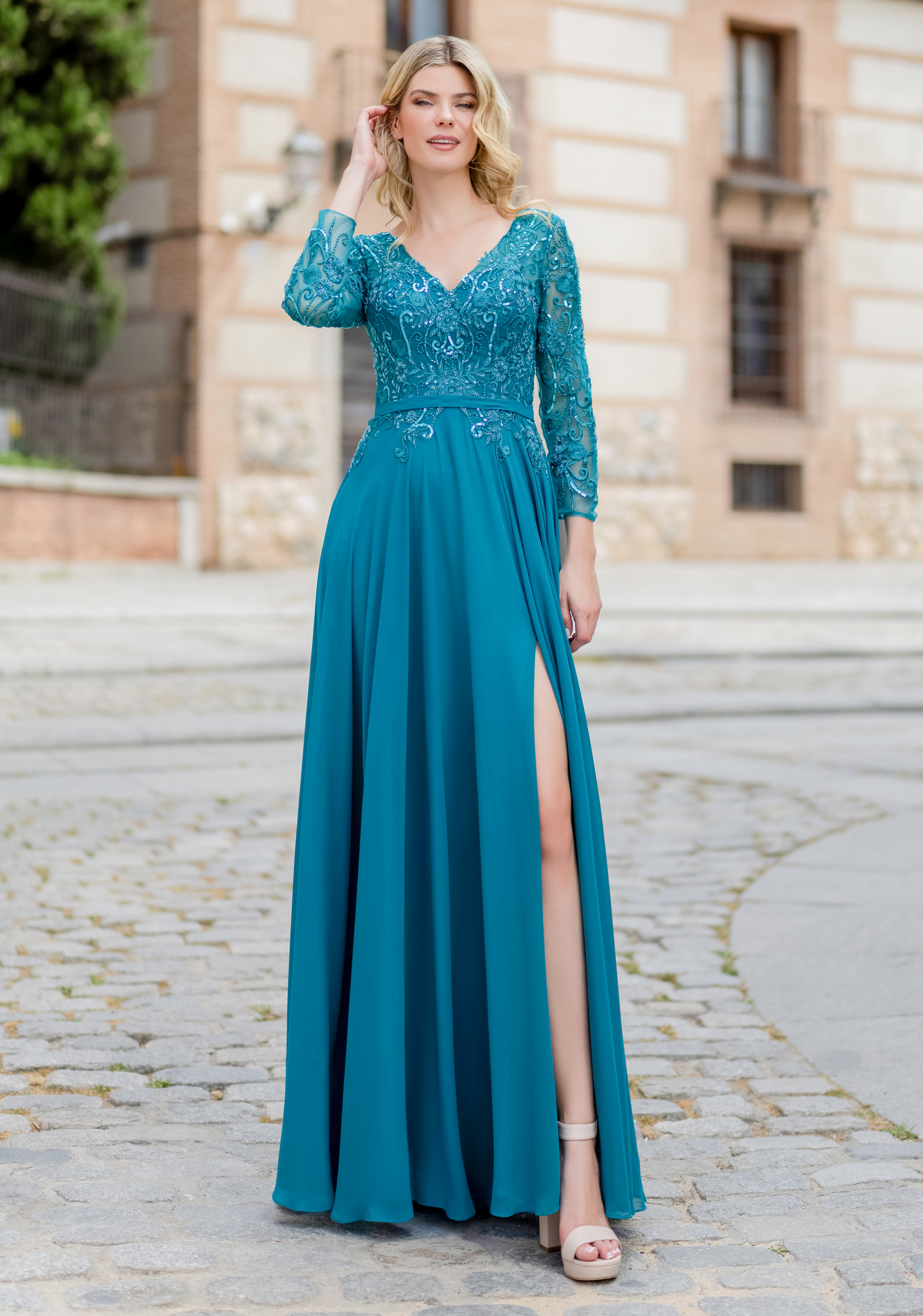 Un abito da cerimonia che unisce leggerezza, fascino e carattere. Questo modello in chiffon verde ottanio conquista per il suo equilibrio perfetto tra romanticismo e audacia. Il corpino ricamato con paillettes tono su tono regala un gioco di luci raffinato, mentre le maniche lunghe in tulle trasparente aggiungono un tocco di femminilità sofisticata.
