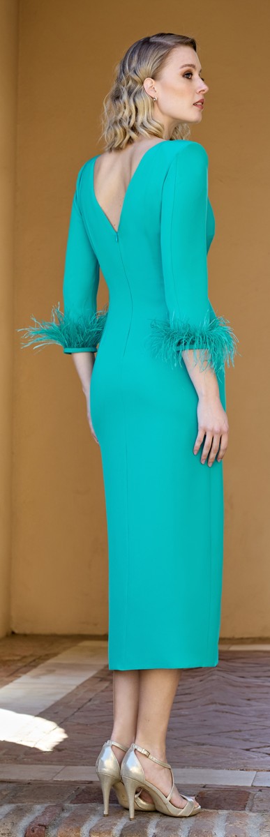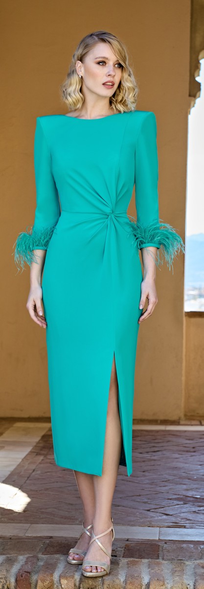 Il design sartoriale valorizza le forme grazie alla costruzione pulita e alla delicata arricciatura laterale, mentre lo spacco frontale dona movimento e sensualità controllata. Il vero elemento distintivo è rappresentato dalle piume di marabou applicate sulle maniche, un dettaglio fashion che trasforma l’abito in una scelta iconica per cerimonie, eventi eleganti e occasioni speciali.