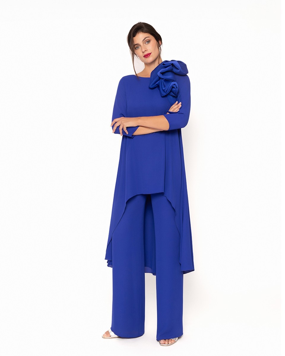 La blusa fluida dal taglio asimmetrico crea movimento e leggerezza, valorizzando la silhouette con naturale armonia. Il dettaglio floreale tridimensionale sulla spalla aggiunge un accento couture che cattura lo sguardo e rende il look esclusivo. Il pantalone palazzo, morbido e slanciato, completa l’insieme garantendo comfort e un’eleganza disinvolta.